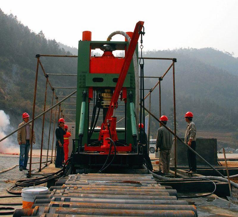 1、打孔钻入:⑴检测动力头出轴的速度;⑵上升动力头至*大部位,把完成于短钻杆的导孔冲击钻头移进钻架基座孔,并且用卡瓦卡死短钻的下边,将卡瓦座入基座圈;⑶将打孔钻杆吊放到机械设备手里,启用旋转架将打孔钻杆送进钻架;⑷起动电机,使动力头正转,将打孔钻杆与动力头连接头,体和短钻杆接好,提到动力头,取出卡瓦;⑸用牵正器将打孔钻杆紧抱并使牵正器外齿轮座入钻架基座齿轮;⑹运行冲水泵和冷却泵,向动力头和制冷机给水;⑺调节相对液流阀,钻压往下钻入;⑻打孔到3-5米时取出牵正器,拆下来打孔钻杆,将推进器和通常钻杆接好进到导孔钻入。